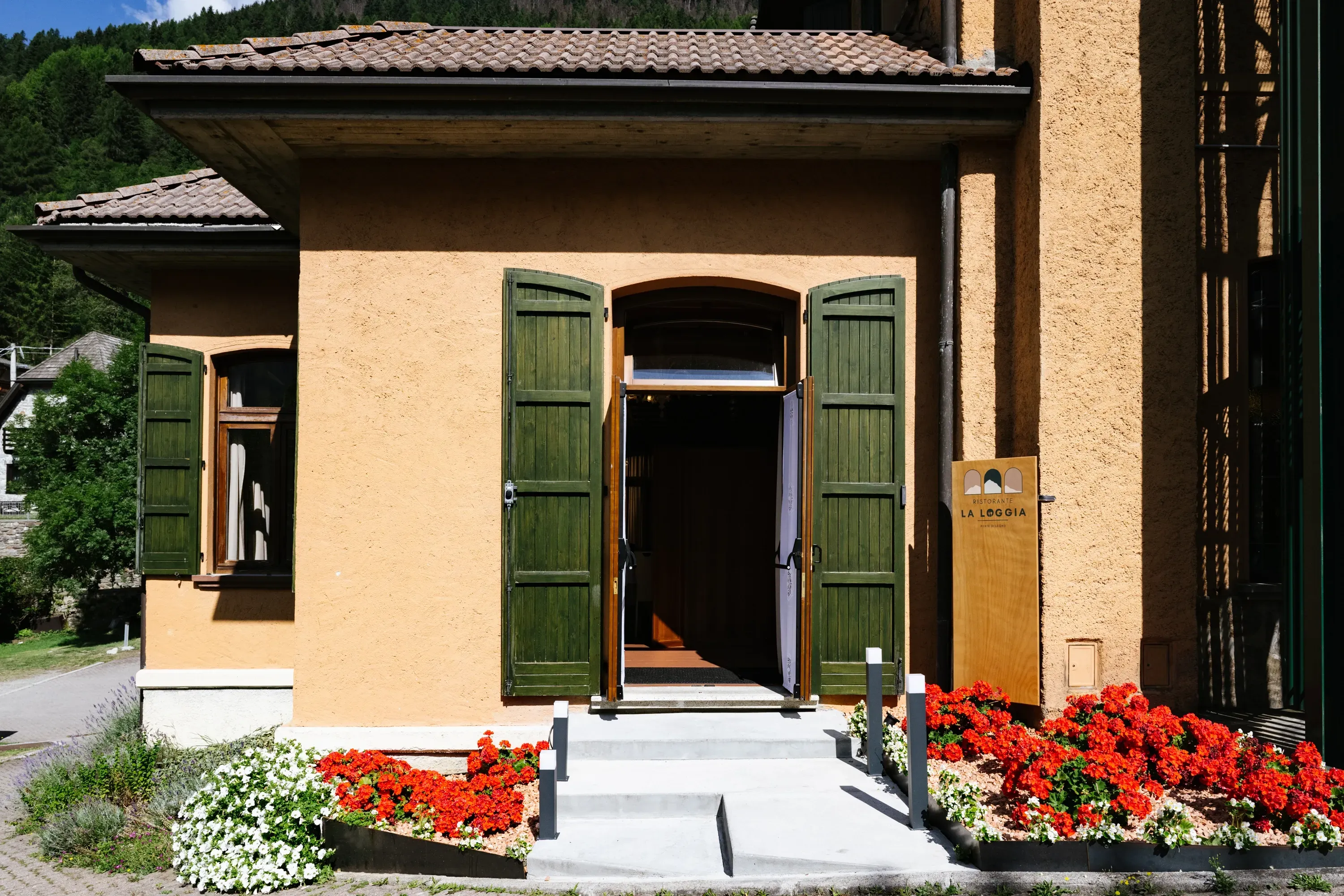 “La Loggia” è un angolo sospeso nel verde, dove ogni tavolo offre una vista privilegiata sull’Adamello e l’Alta Valcamonica.